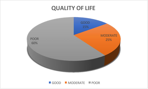 Our study revealed that a significant proportion of patients 74, (72.5%) were male. Similar trends have been observed in previous studies by Frith et al., The majority of patients 38 (37.3%) were between 51-60 years, followed by 23 (22.5%) patients aged 61-70 years. This is consistent with findings from Afdhal et al., who reported that CLD incidence peaks among middle-aged and elderly populations, primarily due to the cumulative impact of long-term alcohol use, viral infections, or metabolic disorders. In our cohort, 77 (75.5%) patients were managed as inpatients, and 25 (24.5%) required outpatient care. This aligns with research by Younossi et al., suggesting that most CLD cases, when identified early, can be managed with inpatient follow-ups unless complications like ascites or variceal bleeding arise.The study found that 65 (63.7%) patients had normal BMI, 25 (24.5%) were overweight, and 12 (11.8%) were obese outcomes in liver disease patients, as indicated by Kamila et al.. A majority 59, (57.8%) reported a history of alcohol consumption, with 12 (11.8%) having both alcohol and smoking habits. Alcohol use is recognized as one of the most common causes of CLD, consistent with the results of Banait et al., which emphasized that chronic alcohol consumption significantly contributes to cirrhosis-related hospitalizations and mortality. Seventy (68.6%) patients had pre-existing comorbid conditions, the most common being type 2 diabetes 17, (16.7%). The presence of diabetes in CLD patients is in line with findings from Maharani et al., who reported that metabolic disorders like diabetes increase the severity of liver disease and worsen outcomes. where 79(53.92%) alcohol consumption predominantly higher in men was highlighted as a major risk factor for liver disease. This gender discrepancy suggests the role of behavioral and lifestyle factors, including alcohol intake, as a dominant factor in the development of CLD shown in Figure 1 which was similar to result of Migbar Sib hat, et al, forty (39.2%) patients had 1-3 mg/dL total bilirubin levels, while 33 (32.4%) patients had 0.5-1 mg/dL direct bilirubin. Low albumin levels were found in 59 (57.8%) patients, indicating impaired liver function. These laboratory values reflect the typical presentation of CLD, where hypoalbuminemia and elevated liver enzymes are common. Fifty-nine (57.8%) patients had elevated AST levels (>40 U/L), and 49 (48.0%) had ALT levels above 35 U/L, indicating active liver damage. Additionally, 52 (51.0%) patients had prolonged prothrombin time (>14 sec), with the impaired synthetic function of the liver observed in cirrhosis cases, as noted by Ivanova Among patients undergoing ultrasound, 13 (12.7%) were found to have cirrhosis with mild hepatomegaly, while 12 (11.8%) had cirrhosis with splenomegaly. Procedures like endoscopic variceal ligation were not performed in 62 (60.8%) patients, and ascitic tapping was not required in 70 (68.6%) patients. where only patients with advanced disease or complications require invasive interventions. Nutritional management was a priority, with all patients in addition, 79 (77.5%) patients were on protein supplements and antibiotics, and 66 (64.7%) were prescribed diuretics. These interventions align with current guidelines recommending adequate protein intake and diuretics for patients with ascites, as which was similar to result of European Association for the Study of the Liver (EASL). Out of 102 patients, 89 (87.3%) showed improvement in their condition, while 6 (5.9%) patients unfortunately succumbed 7(6.86%)patients were Lama. These outcomes emphasize the importance of timely diagnosis and comprehensive management, as observed in other studies like Matos et al., which reported higher survival rates with early intervention. Using the SF-36 questionnaire, several aspects of HRQOL were evaluated. Sixty (58.8%) patients reported low energy or fatigue, indicating that fatigue is a prevalent and distressing symptom among CLD patients, Fifty-four (52.9%) patients had low physical functioning, reinforcing the idea that impaired physical capacity is common in chronic conditions like liver disease. Seventy-two (70.6%) reported bodily pain, underscoring the significant physical discomfort experienced by this population. Fifty-five (53.9%) patients reported average general health perception, showing a mix of physical and mental well-being concerns. Sixty-one (59.8%) patients had low physical role functioning, and 65 (63.7%) had low emotional role functioning, though 49 (48.0%) reported high social role functioning. Despite emotional challenges, these findings suggest that social support remained relatively intact. Additionally, 69 (67.6%) patients had low mental health scores, emphasizing the need for psychological interventions, which found that depression and anxiety are frequent comorbidities in liver disease patients. Overall, 61 (59.8%) patients had poor quality of life, 26 (25.5%) had moderate quality of life, and 1 (1.0%) patient reported good quality of life shown in Figure 2. With respect to gender, the majority of males (48, 47.1%) reported poor quality of life. In terms of age, the highest proportion (26, 25.5%) of patients with poor quality of life was in the 51-60 years group. Regarding social history, 49 (48.0%) alcoholics had poor quality of life. Among the 57 (55.9%) newly diagnosed CLD patients, 35 (34.3%) had poor quality of life, while 34 (33.3%) previously diagnosed patients also reported poor quality of life. In terms of age younger participants, especially those in the 20-40 age range, reported higher QoL scores, with all individuals in these age groups scoring between 85-100. In contrast, the older age groups exhibited progressively lower scores. Specifically, 65% of participants aged 51-60 scored in the 0-50 range, while those aged 61-70 and 71-80 had the lowest QoL, with 90.9% and 100% of individuals in these groups, respectively, scoring in the 0-50 range. This di