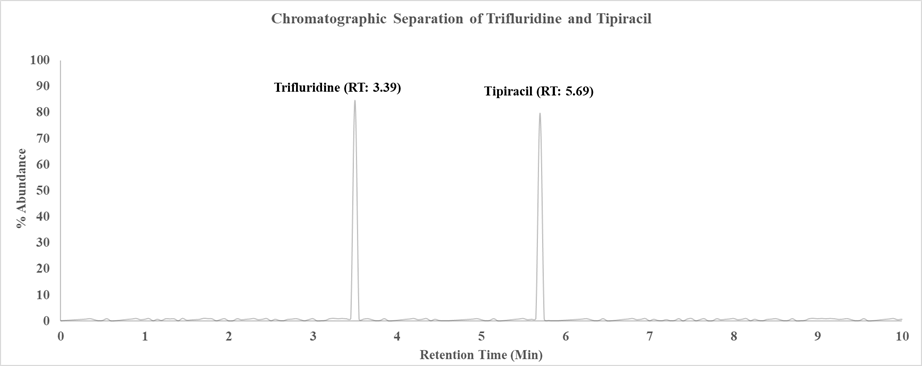 The developed RP-HPLC method successfully achieved baseline separation of Trifluridine and Tipiracil under optimized chromatographic conditions. The retention times were found to be approximately 3.39 minutes for Trifluridine and 5.69 minutes for Tipiracil, with clear resolution and no interference from excipients or mobile phase components. The chromatograms demonstrated sharp, symmetrical peaks with acceptable tailing factors (<1.5), confirming system suitability (Figure 1).